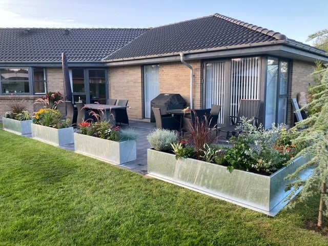 Super skønne lange højbede i galvaniseret stål, som laves i mange forskellige størrelser.